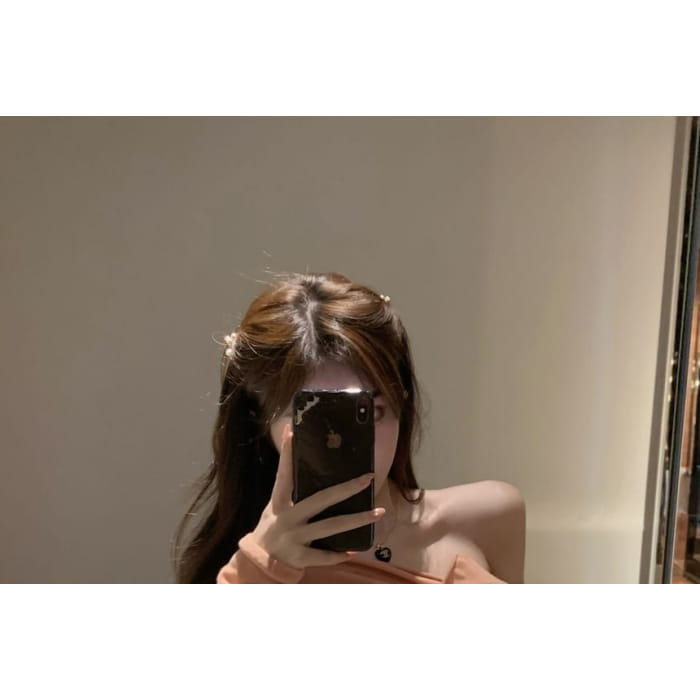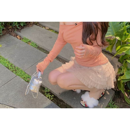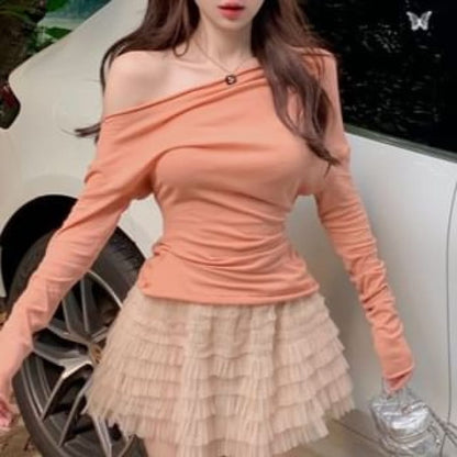 Long-Sleeve Off-Shoulder Plain Slim Fit T-Shirt / High Waist Tiered Mini A-Line Tulle Skirt