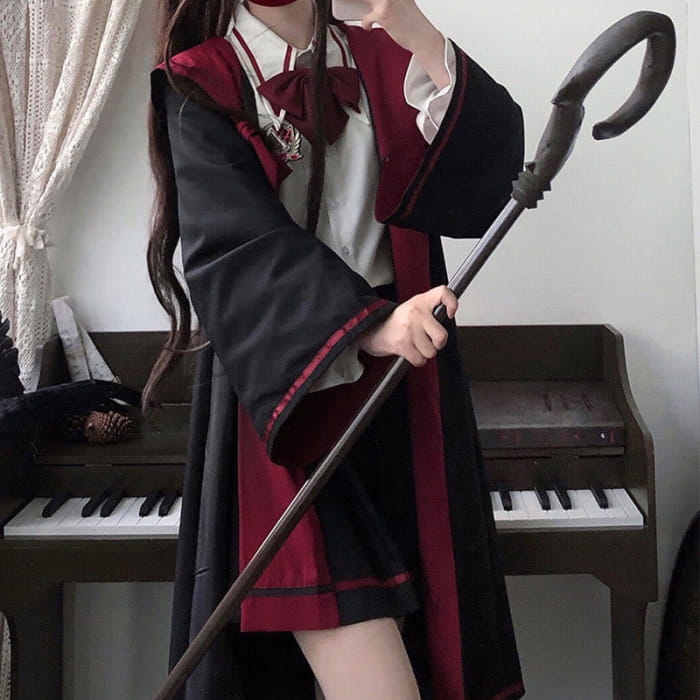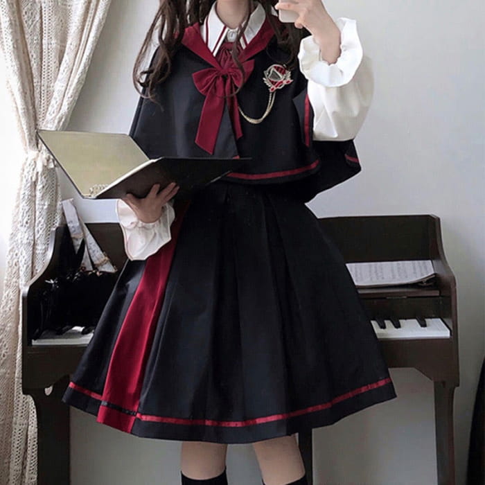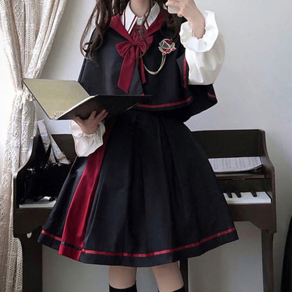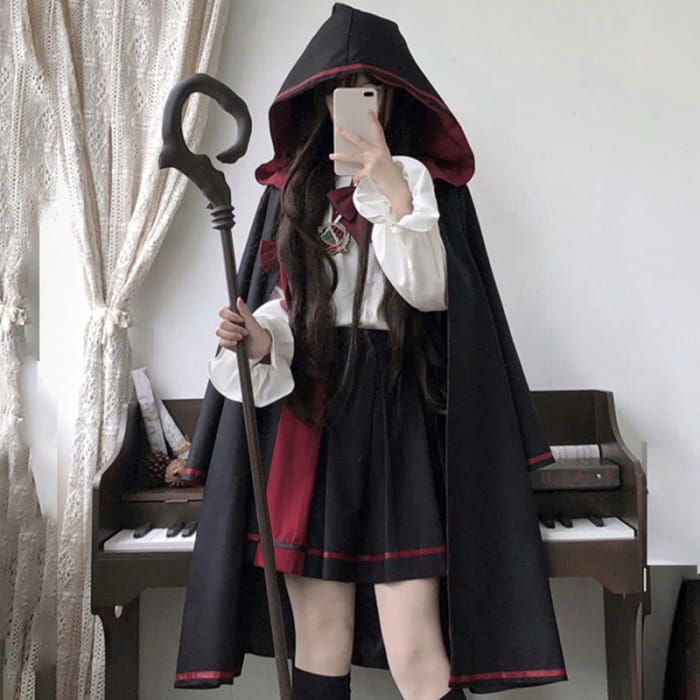 Long Sleeve Shirt Pleated Skirt Hooded Cloak Three Pieces Set