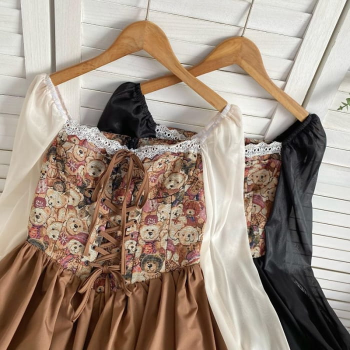 Long-Sleeve Square Neck Bear Patterned Lace Up Panel Mini A-Line Dress