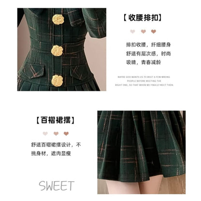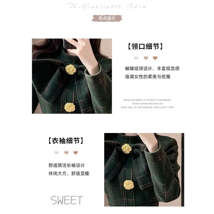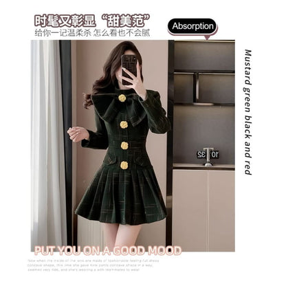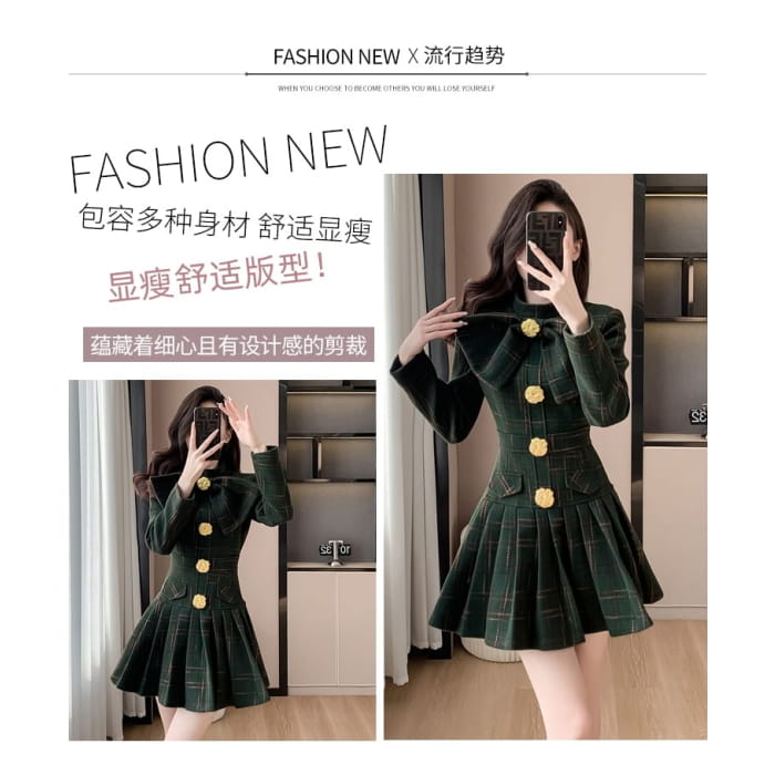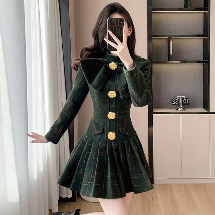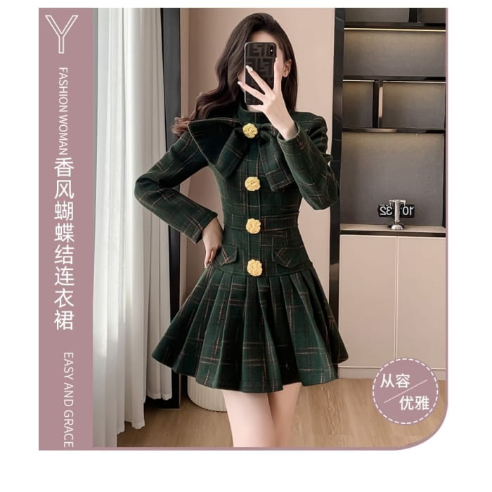 Long Sleeve Stand Collar Bowknot Plaid Pleated Mini A-Line Dress