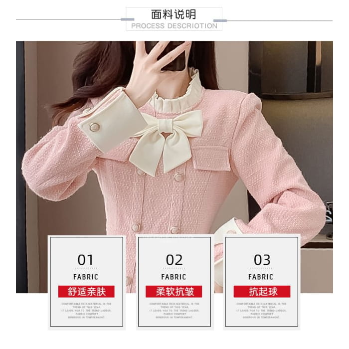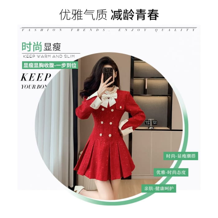 Long Sleeve Stand Collar Bowknot Tweed Mini Pleated A-Line Dress