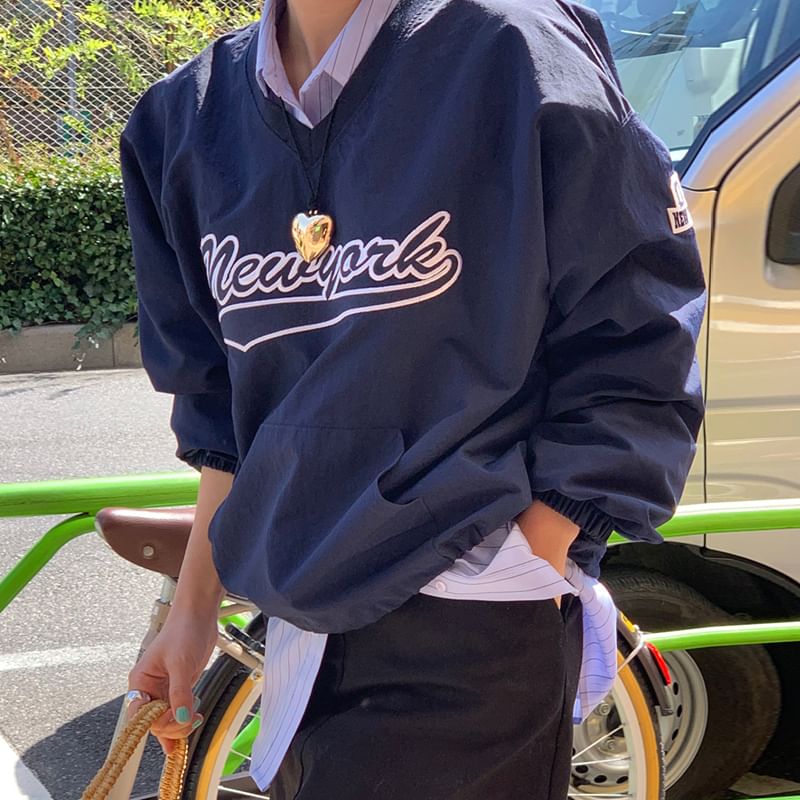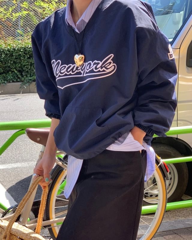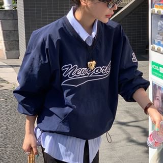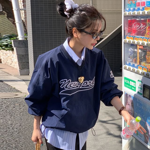Long Sleeve V-Neck Lettering Embroidered Drawstring Top