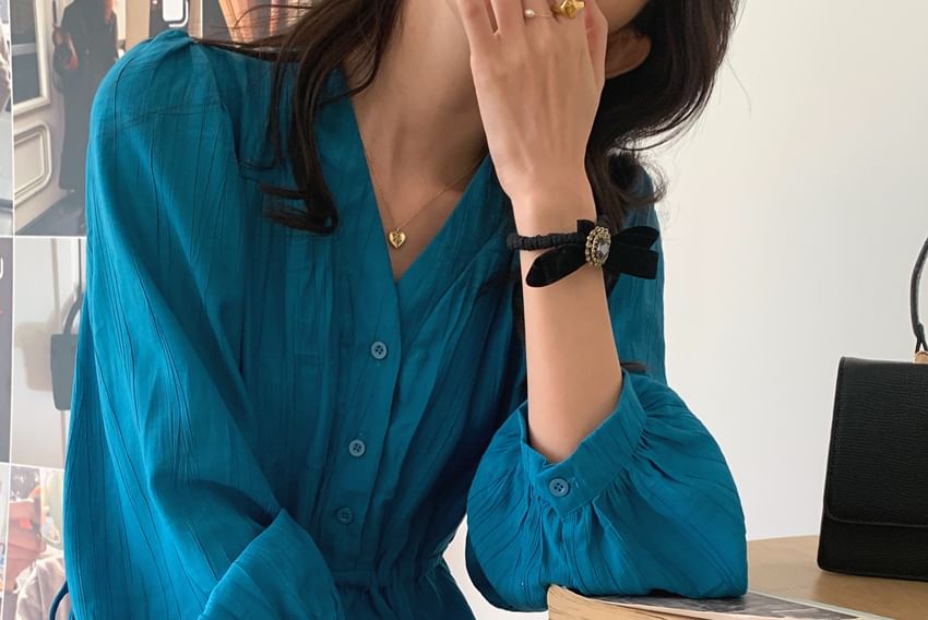 Long Sleeve V-Neck Plain Gathered Drawstring-Waist Button Midi A-Line Dress