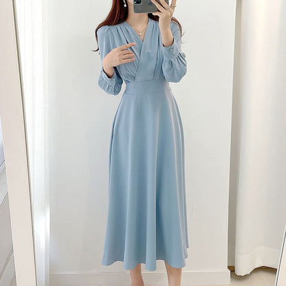 Long-Sleeve V-Neck Plain Midi A-Line Dress