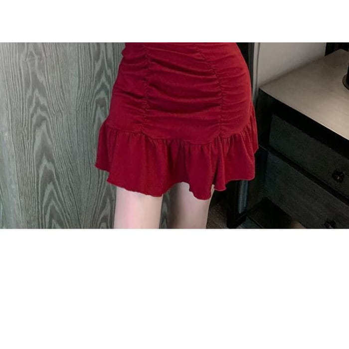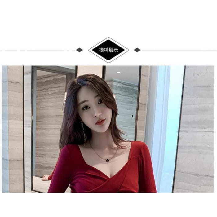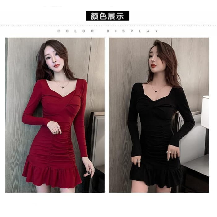 Long-Sleeve V-Neck Plain Mini Bodycon Dress