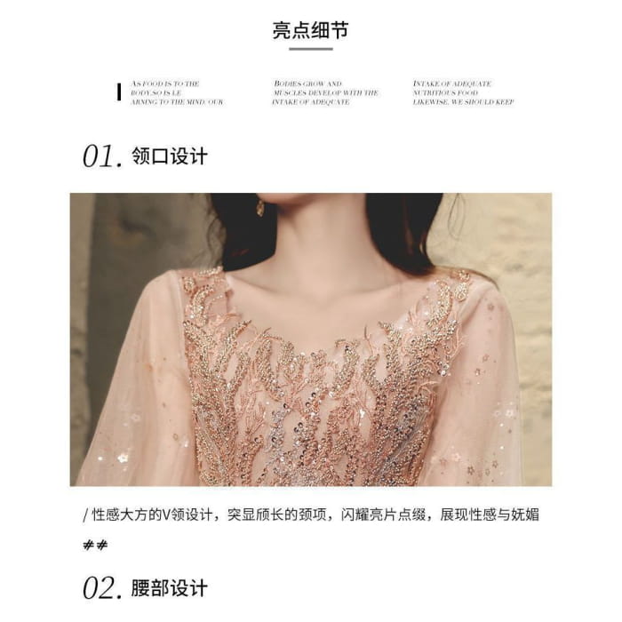 Long-Sleeve V-Neck Sequined Floral Sheer Overlay A-Line Evening Gown