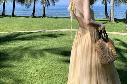 Maxi Plain Dress A-Line Spaghetti Slit Strap Cutout Ruffle