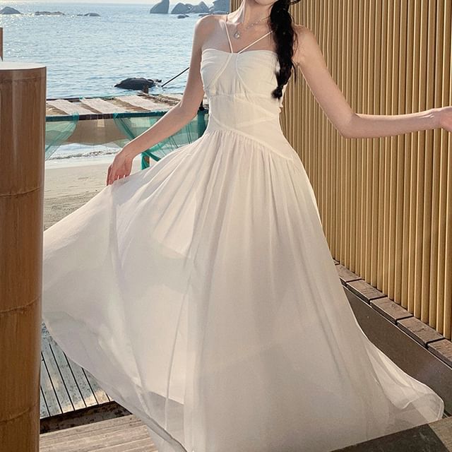 Maxi Strap A-Line Ruched Dress Spaghetti Plain