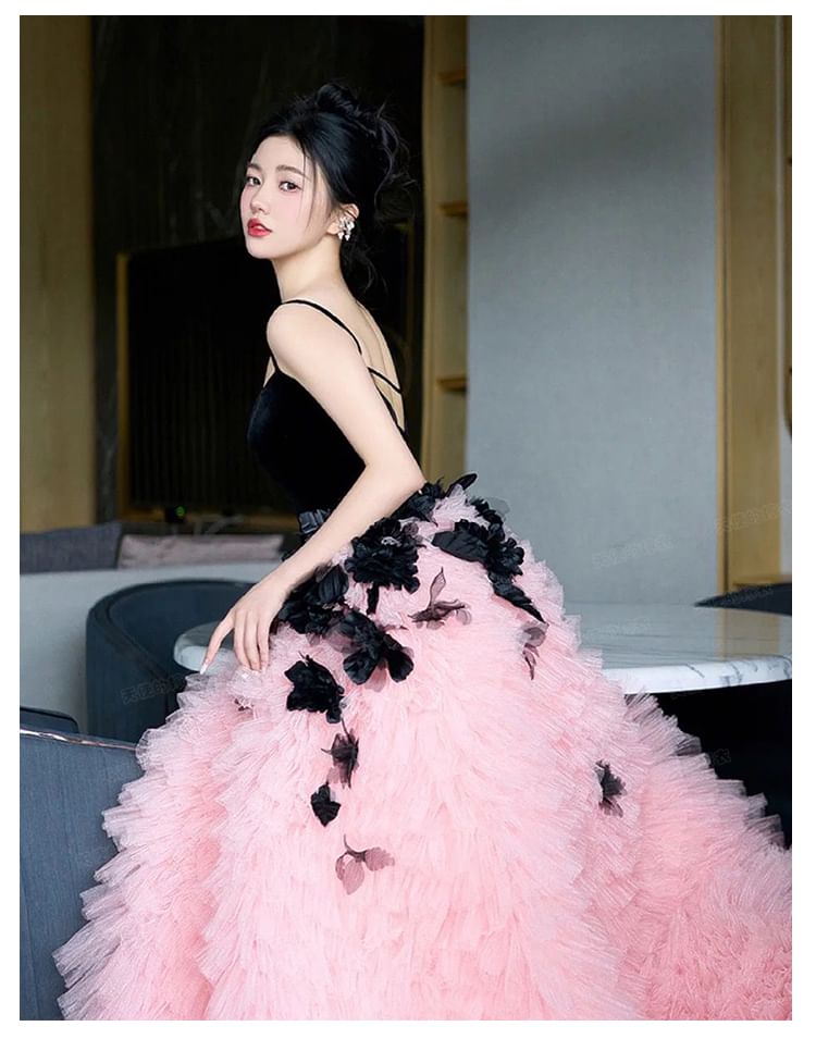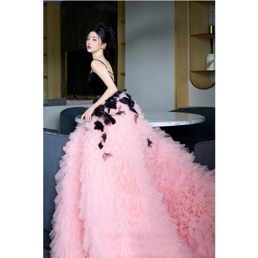 Spaghetti Strap Two Tone Floral Applique Tiered Panel Mesh A-Line Evening Gown