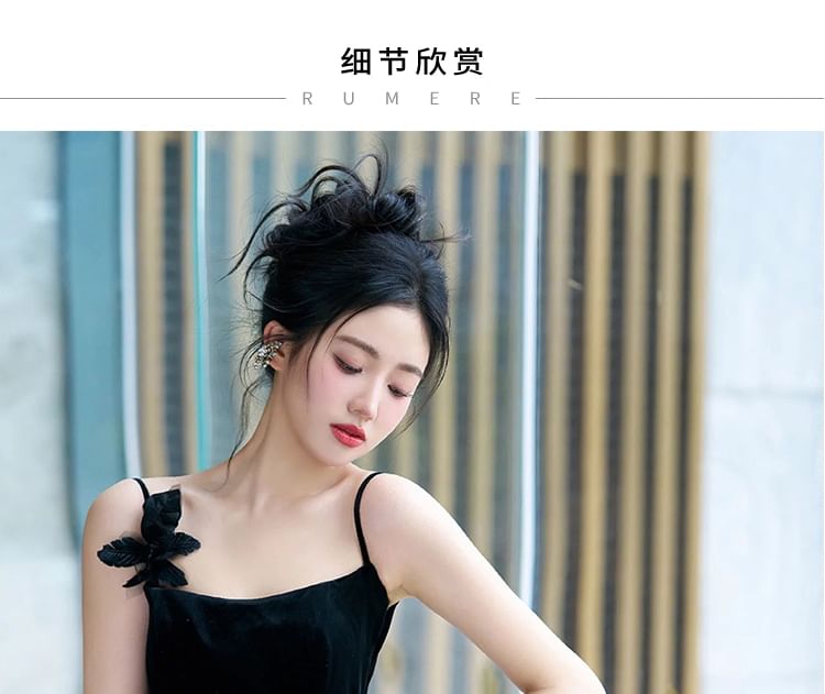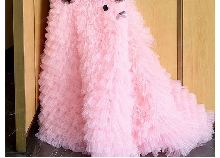 Mesh Panel Spaghetti Applique Tiered Floral Tone Two Strap A-Line Gown Evening
