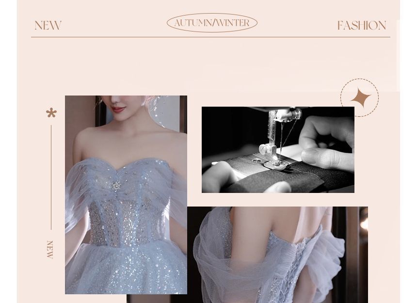 Midi Shoulder Glitter Evening Cold A-Line Gown