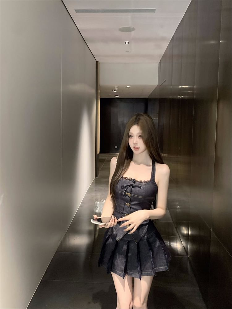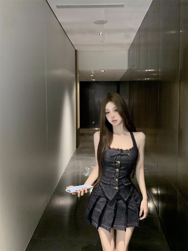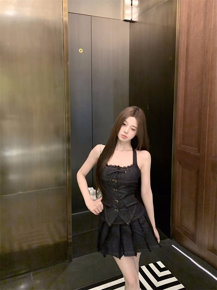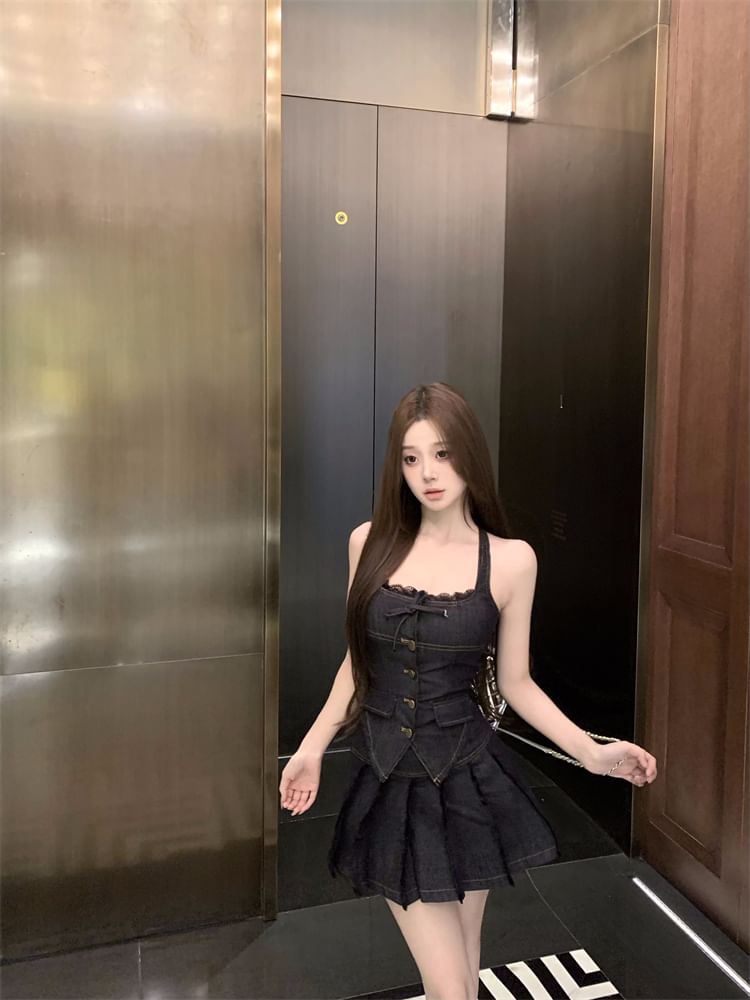 Lace Trim Button-Up Denim Halter Top / Mid Low Rise Pleated Mini A-Line Skirt