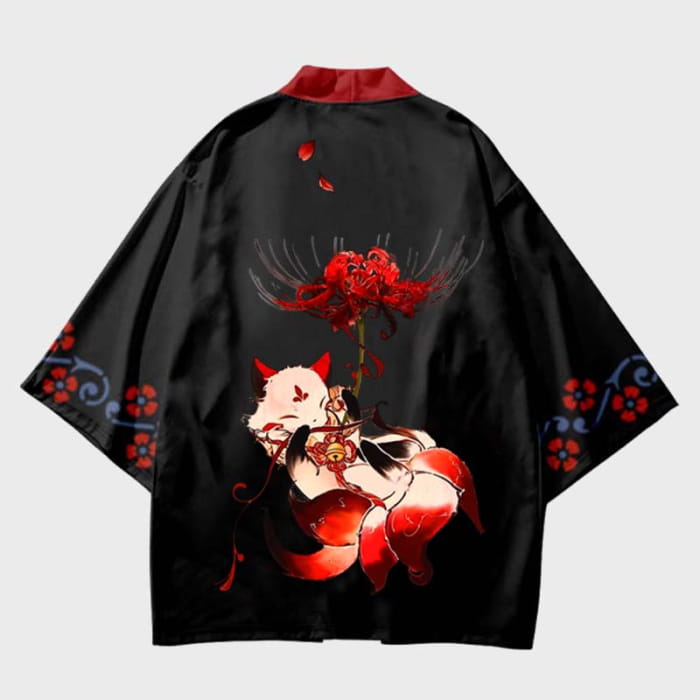 Vintage Fox Equinox Flower Black Kimono Outerwear
