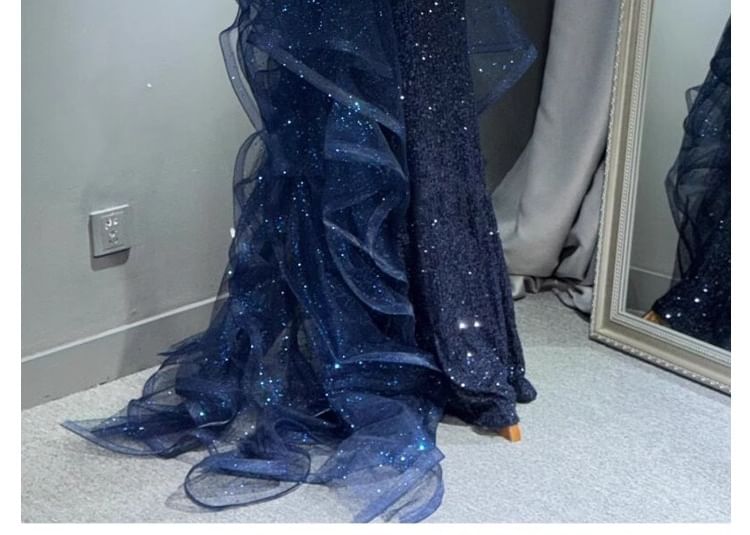 Neck Mesh Halter Mermaid Panel Sequin Gown Trained Evening