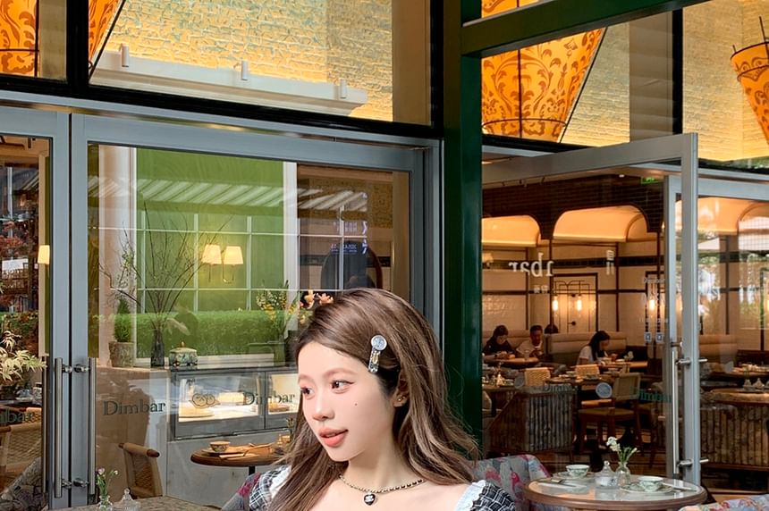 Neck Plaid Sleeve Square Top Short Shirred Bow