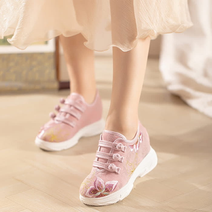 Pink Blossom Embroidery Buckle Platform High Heels Shoes