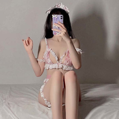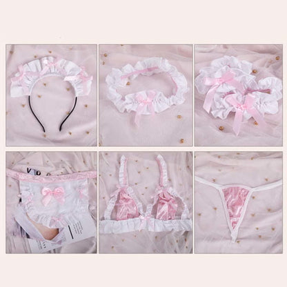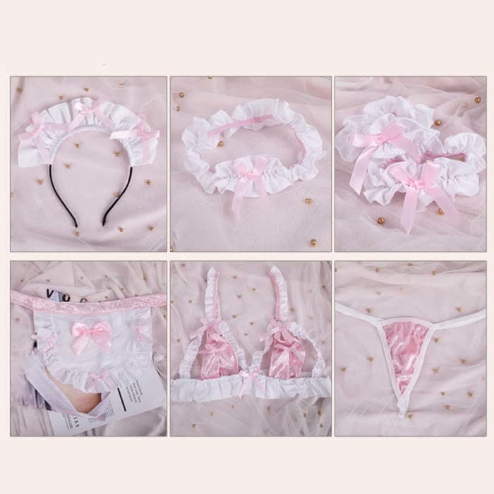 Pink Maid Bow Knot Lace Hollow Out Bikini Lingerie
