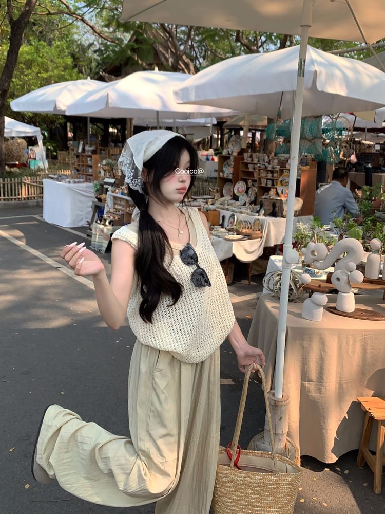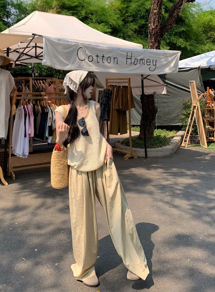 Plain Leg High Waist Pants Wide Top Tank Knit / Neck Scoop Sleeveless