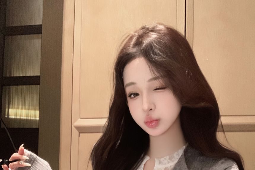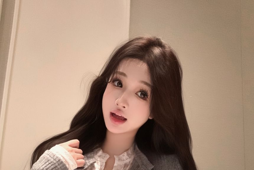 Plain Lace Trim Mock Two-Piece Ribbed Slim Fit Cardigan