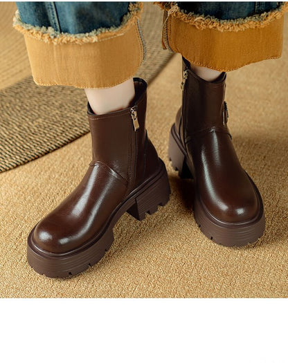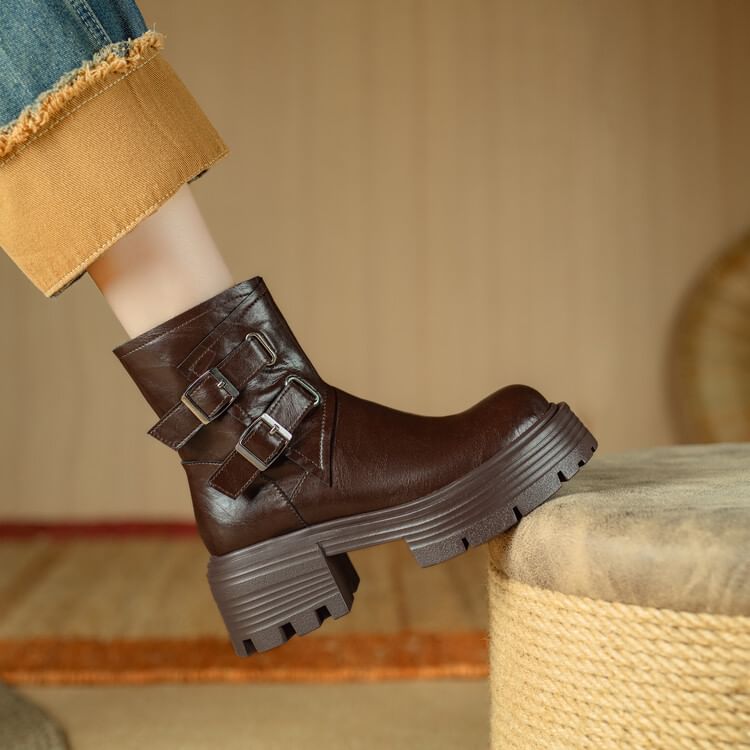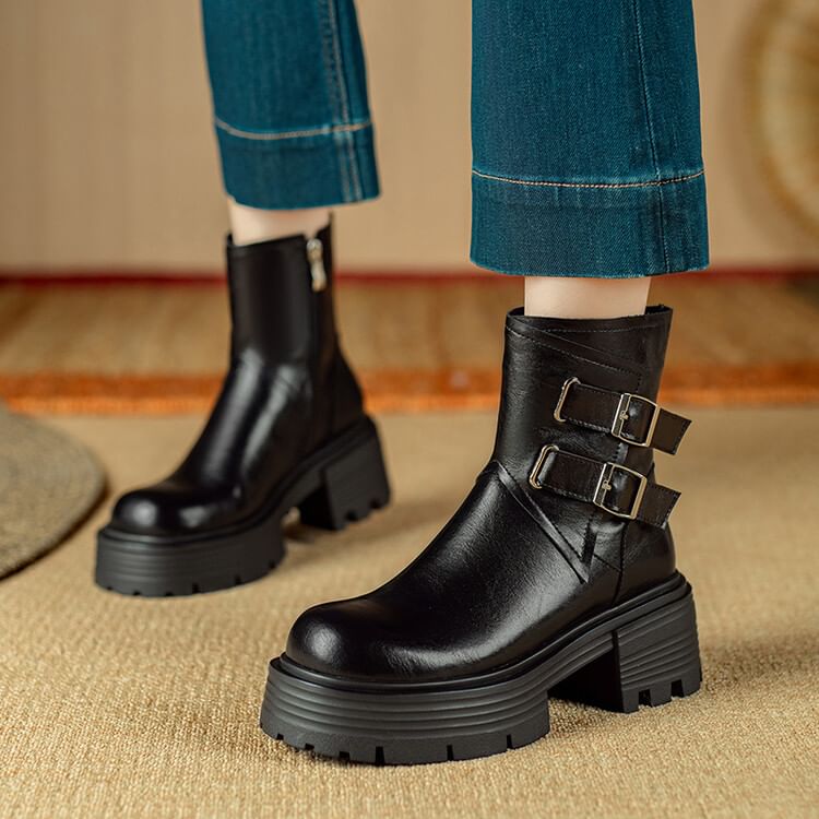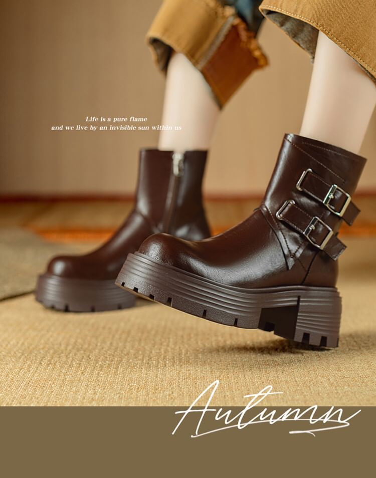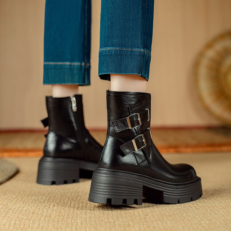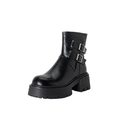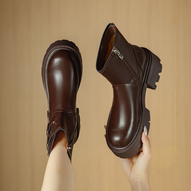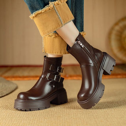 Platform Plain Buckled Zip-Up Genuine Leather Short Boots
