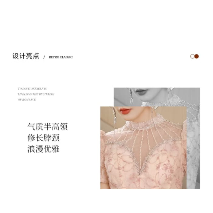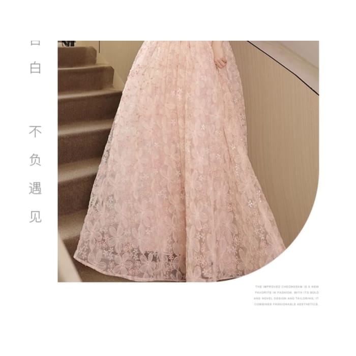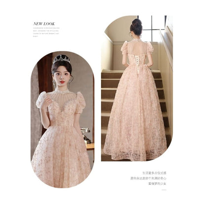 Puff-Sleeve High Neck Mesh Panel Floral Print Rhinestone A-Line Evening Gown