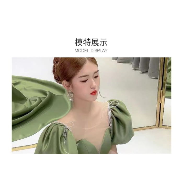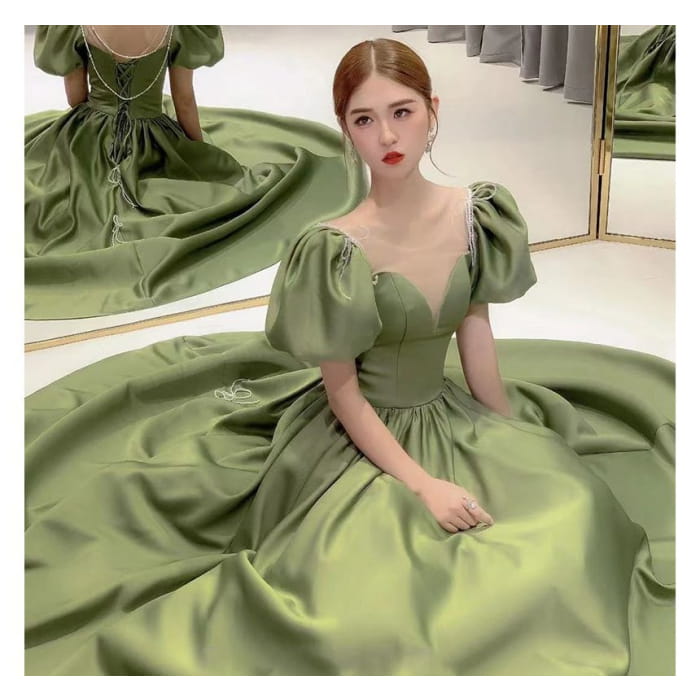 Puff Sleeve Scoop Neck Faux Pearl Beaded Mesh Panel Satin A-Line Evening Gown