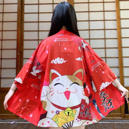 Red Anime Lucky Cat Cardigan Kimono Outerwear