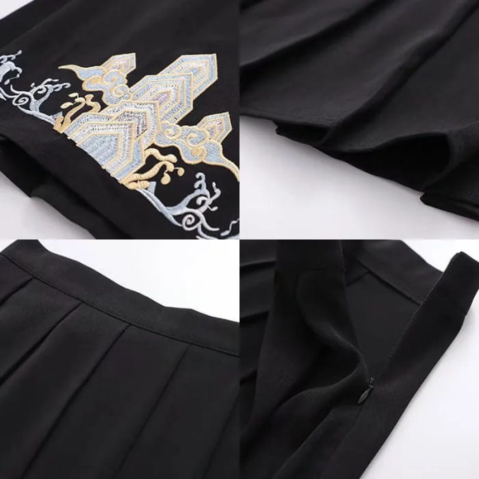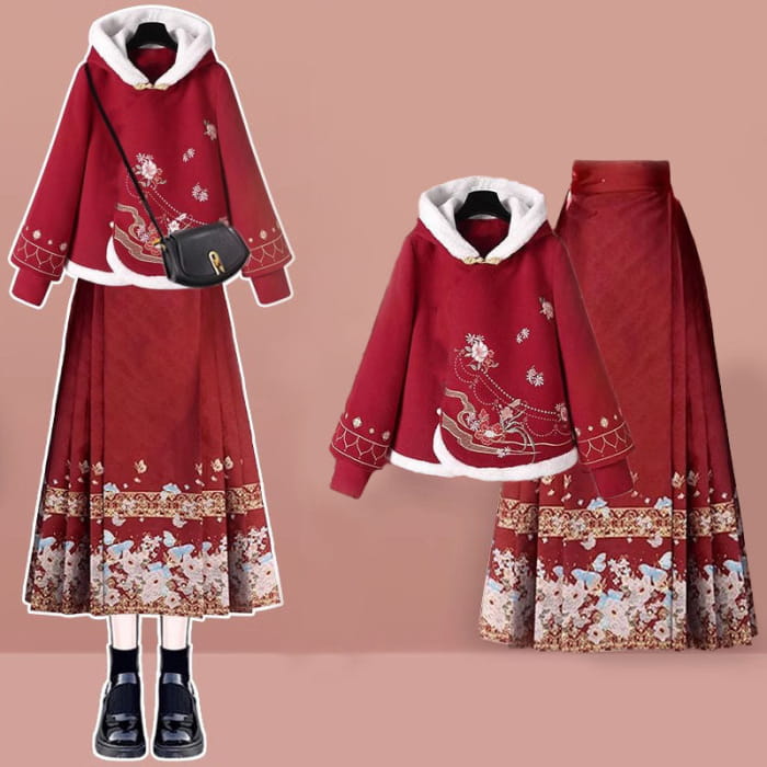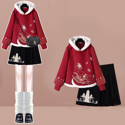 Red Flower Embroideried Hoodie Plush Pleated Skirt