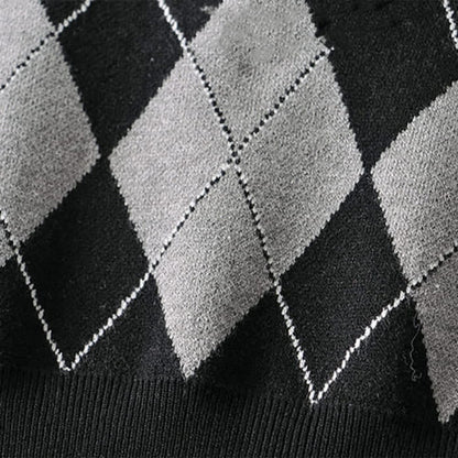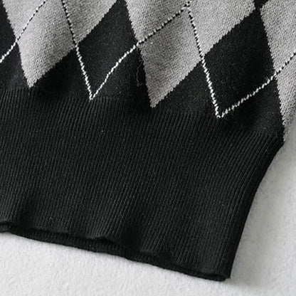 Rhombus Print Knit Vest Puff Sleeve Shirt Split Pants