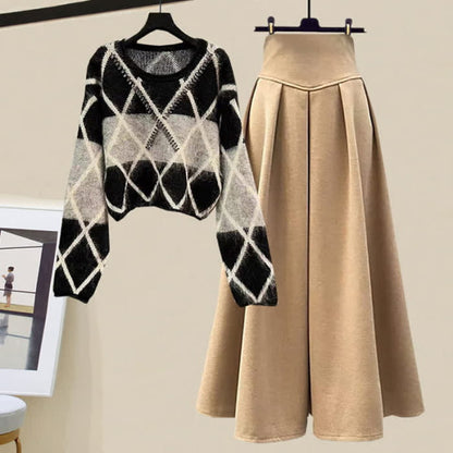 Rhombus Stripe Colorblock Sweater Long Skirt