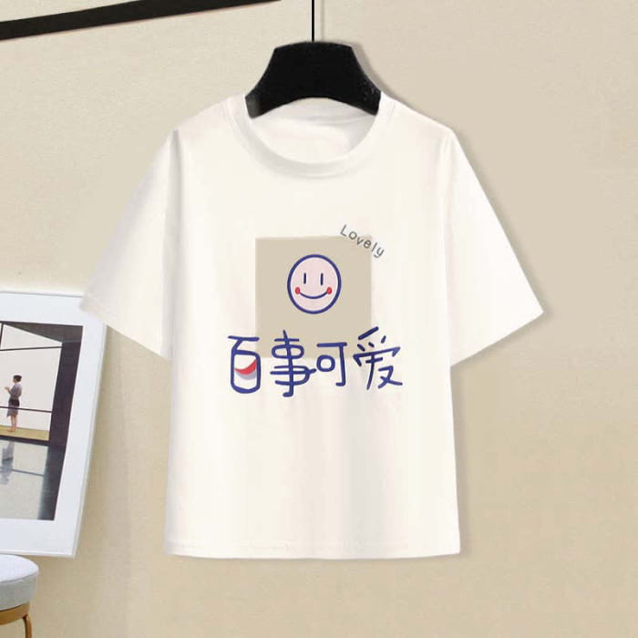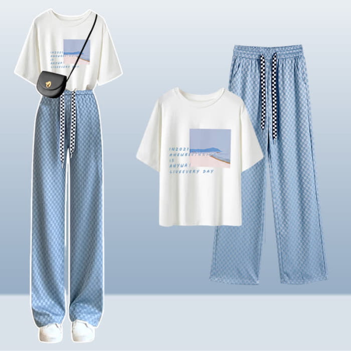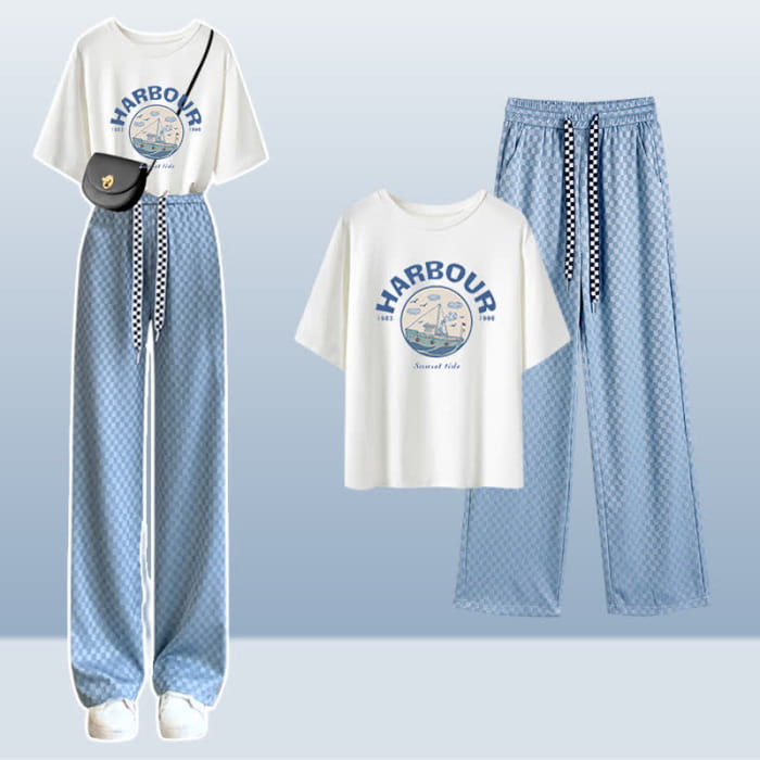 Round Collar Bear Print Casual T-Shirt Lattice Blue Pants