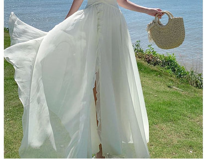 Ruffle Dress Plain A-Line V-Neck Maxi Front-Slit Halter