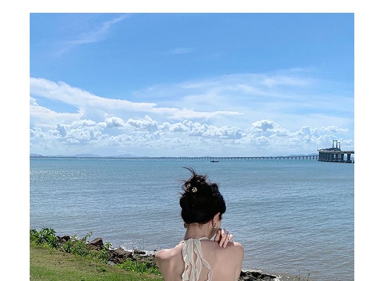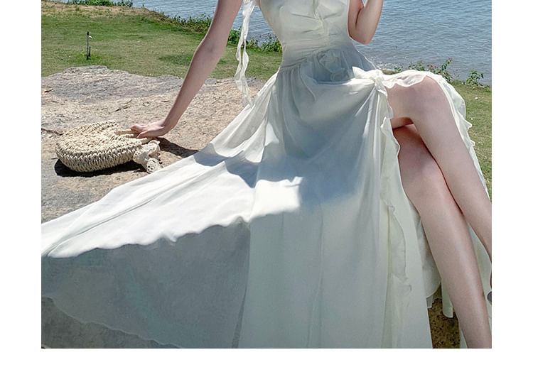 Halter V-Neck Plain Ruffle Front-Slit Maxi A-Line Dress