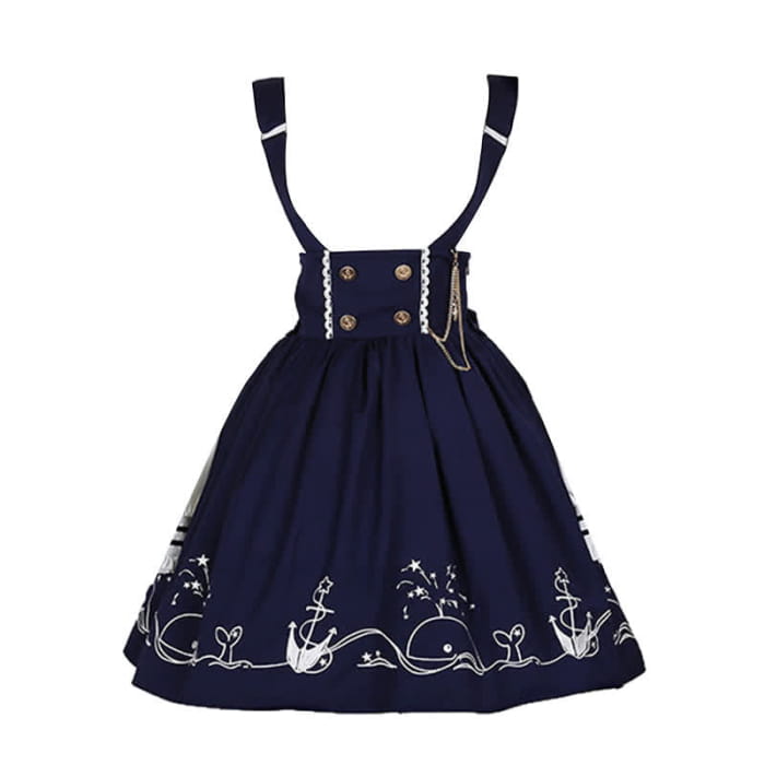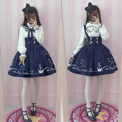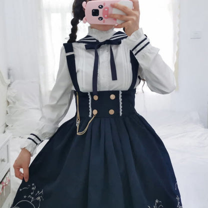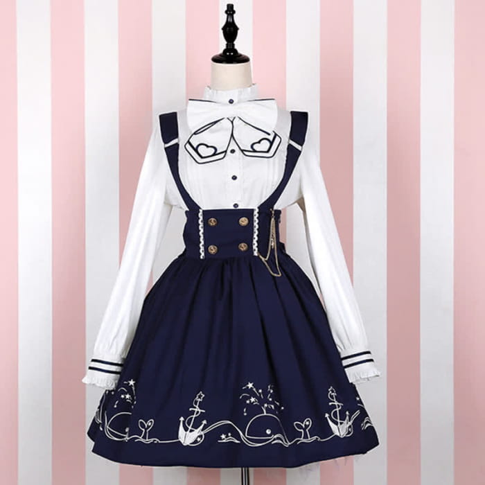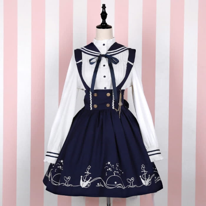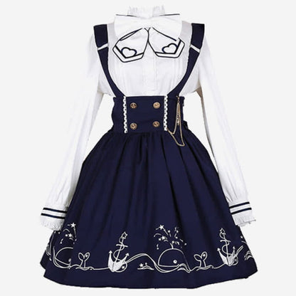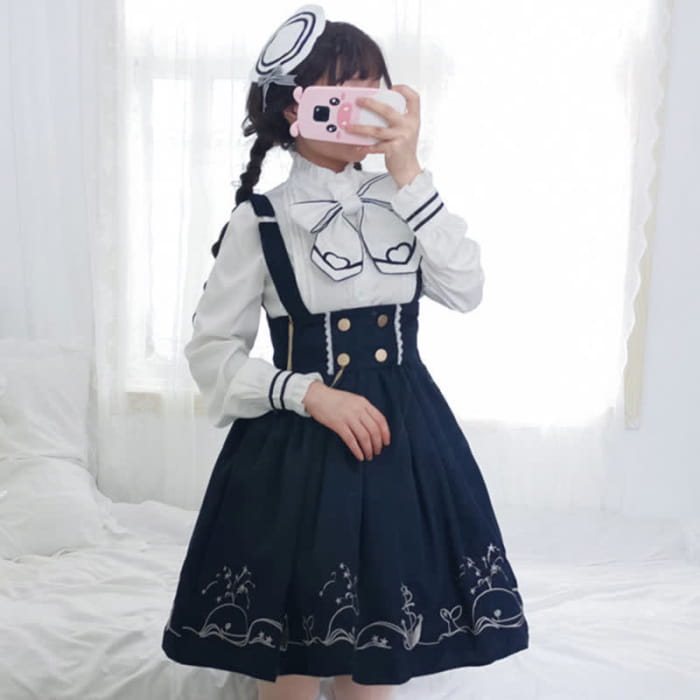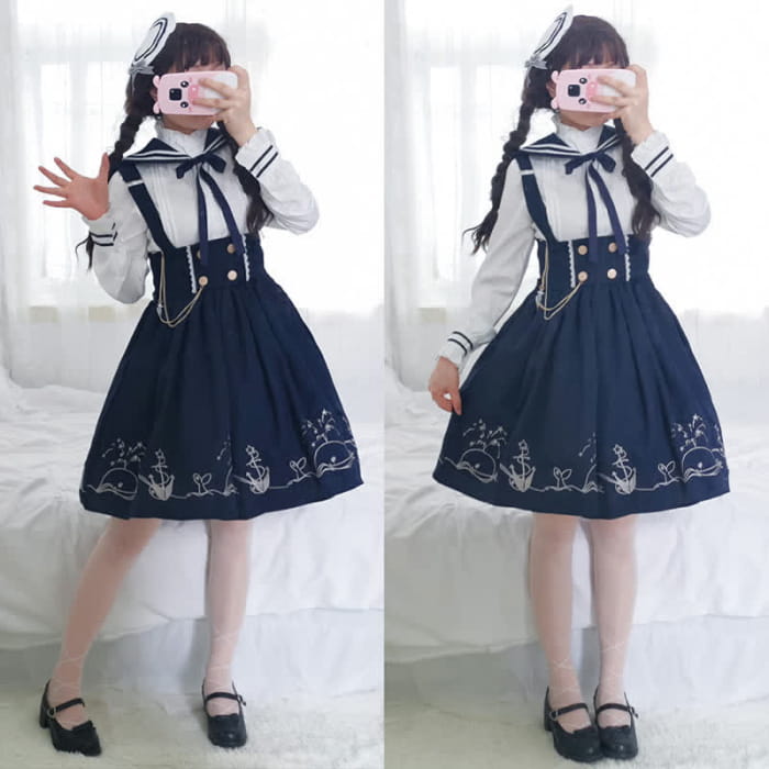 This elegant Sailor Collar Shirt Cartoon Dolphin Print Suspender Skirt is perfect for anyone who wants to add a touch of whimsy to their wardrobe. The unique design features a cute cartoon dolphin print and a classic sailor collar, creating an eye-catching look. The stylish suspender skirt adds a playful element, making it a fun and fashionable choice for any occasion.