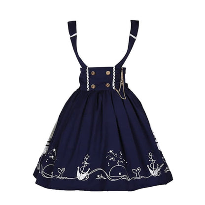 Sailor Collar Shirt Cartoon Dolphin Print Suspender Skirt