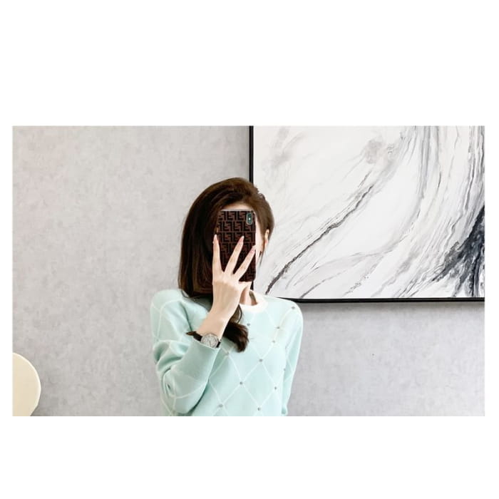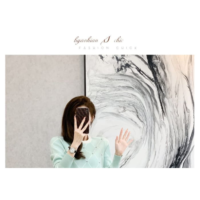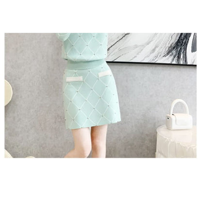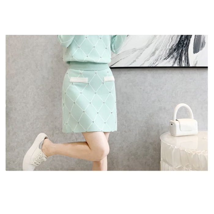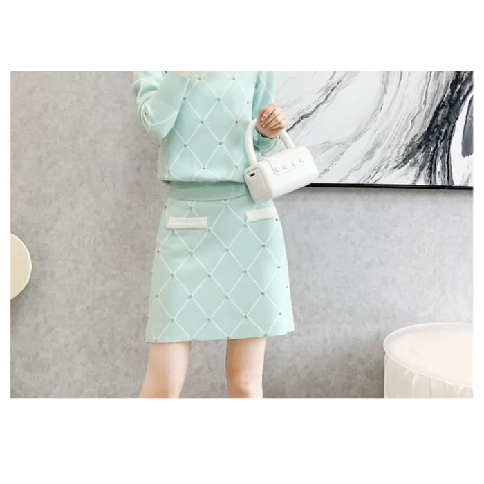 Set: Crew Neck Plaid Rhinestone Sweater + High Waist Mini A-Line Skirt