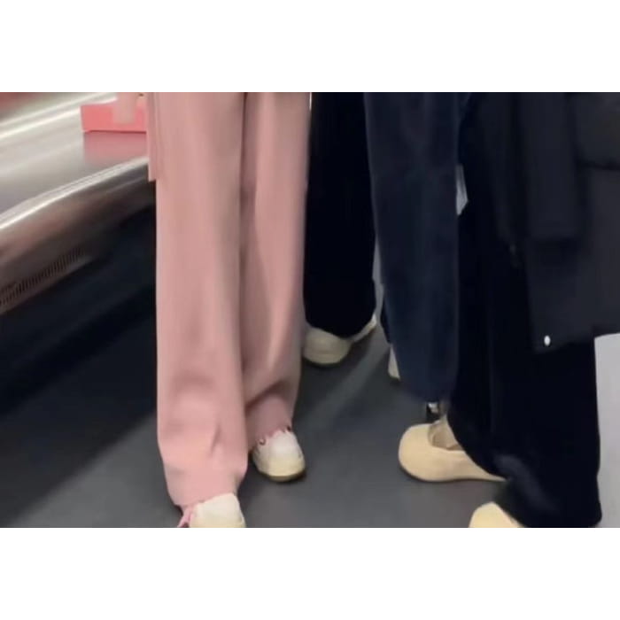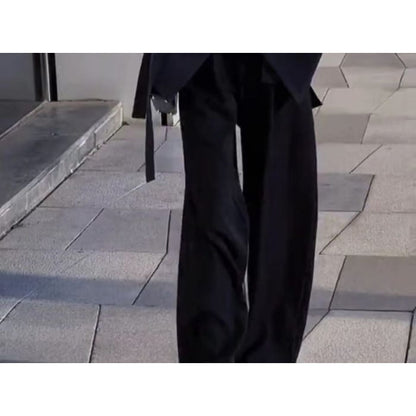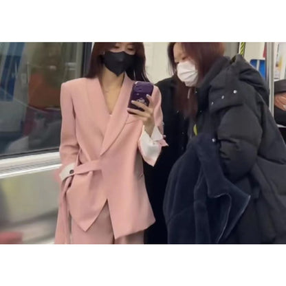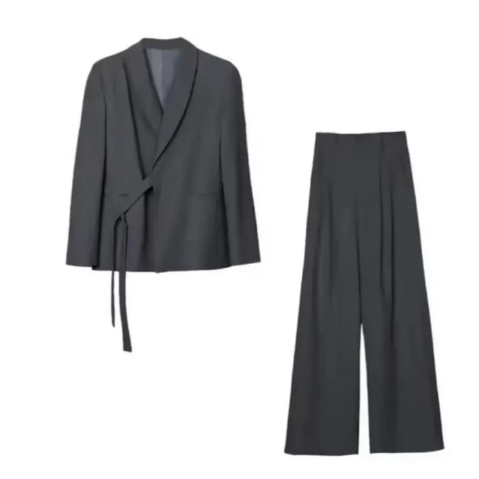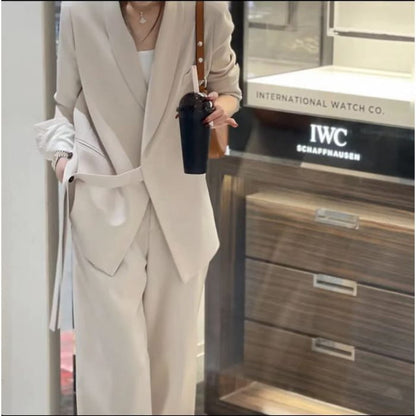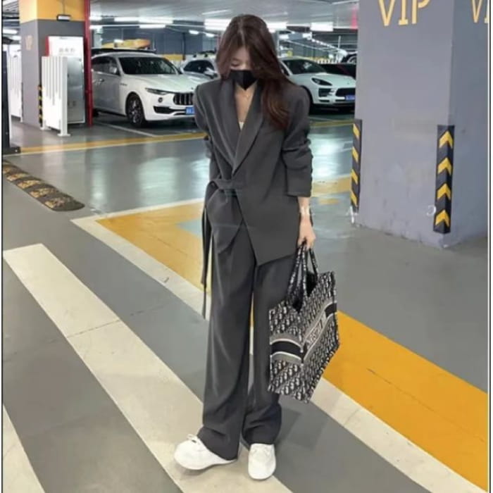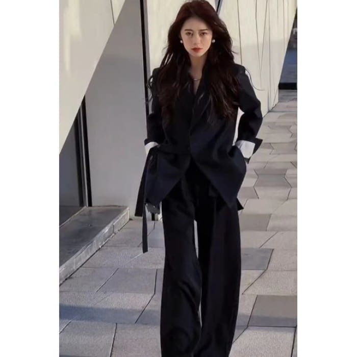 Set: Plain Tie-Strap Blazer + Loose Fit Slacks