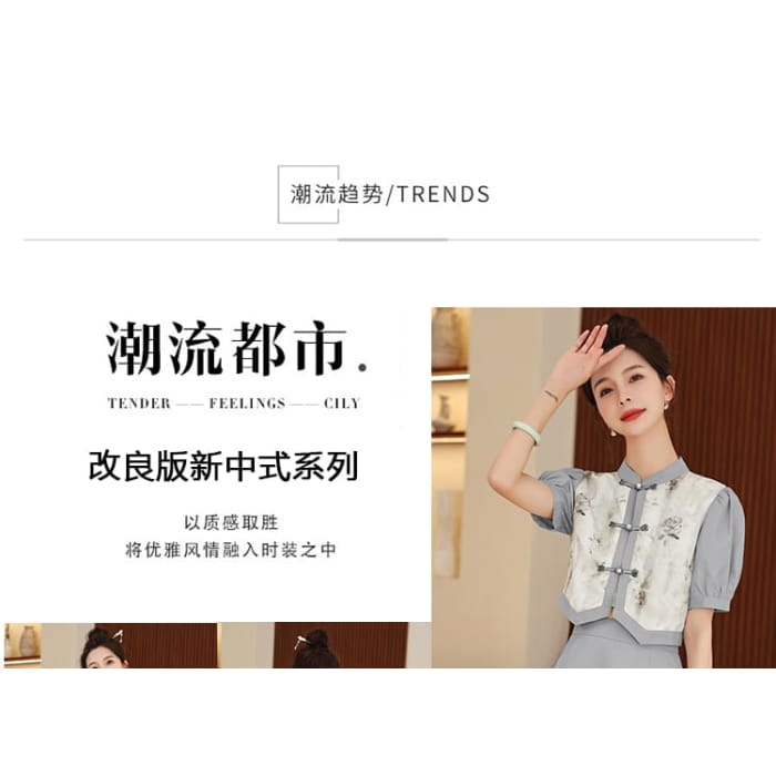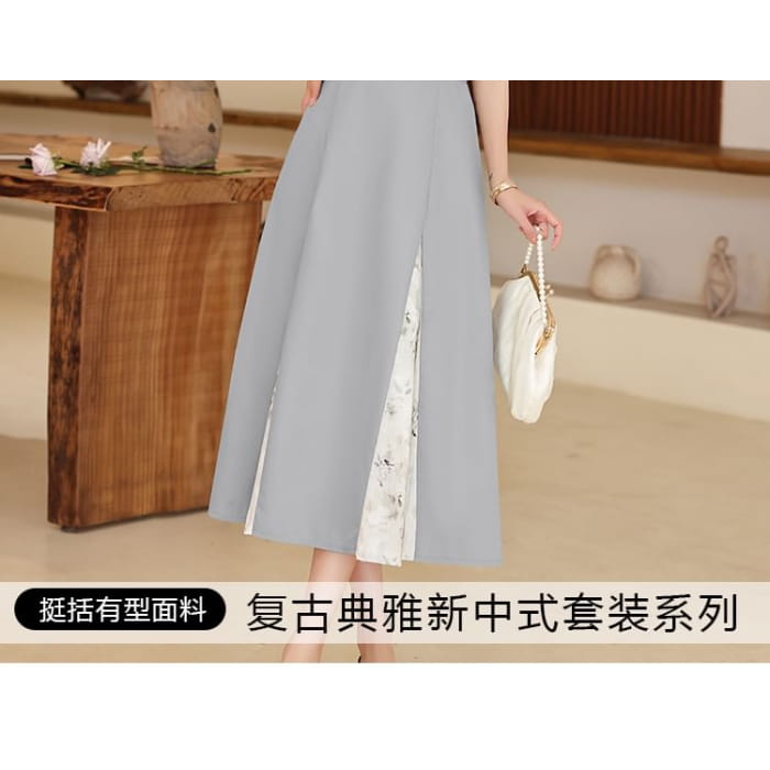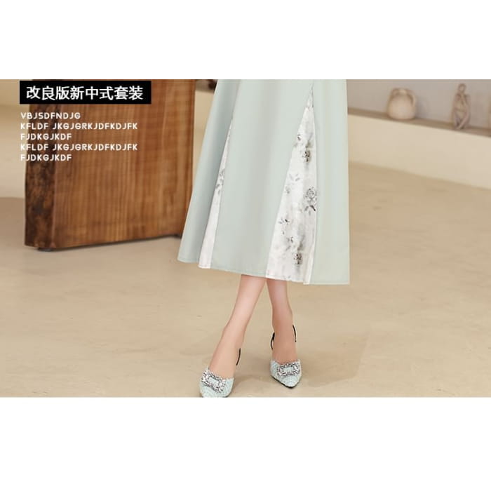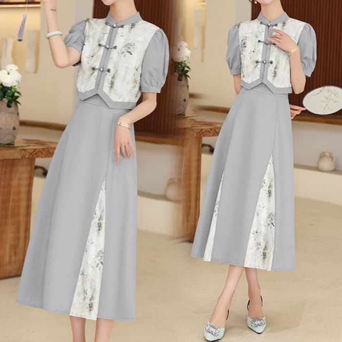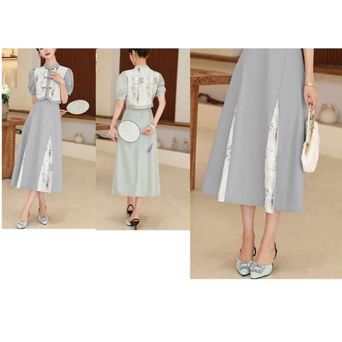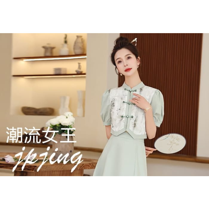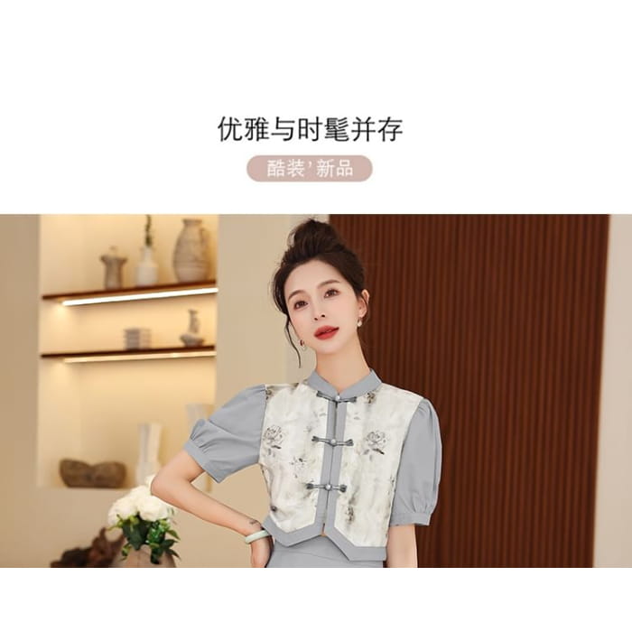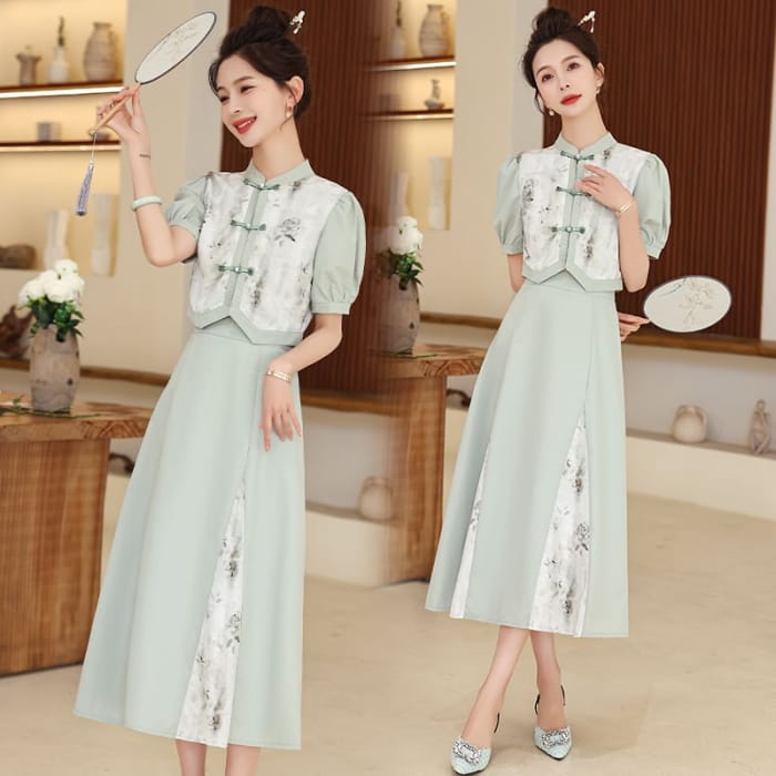 Set: Short-Sleeve Mandarin Collar Floral Panel Frog Button Cropped Blouse + High Waist Midi A-Line Skirt