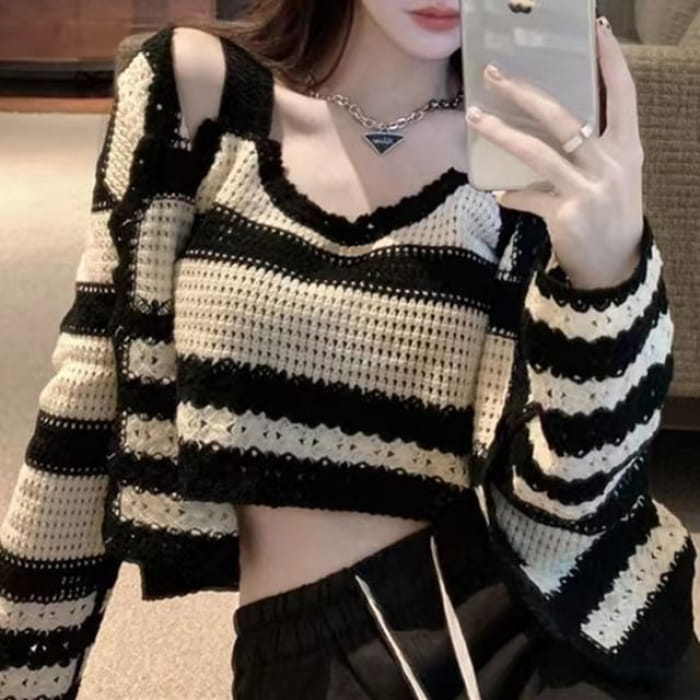 Set : Striped Cutout Cardigan + Striped Knit Tank Top
