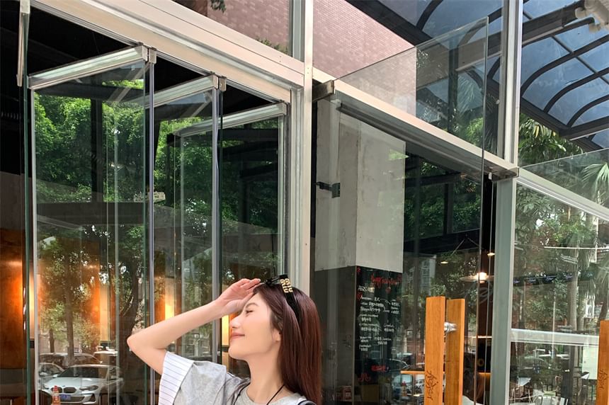 Short Round Sleeve Neck Striped Print Lettering Panel T-Shirt