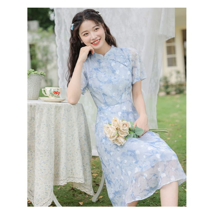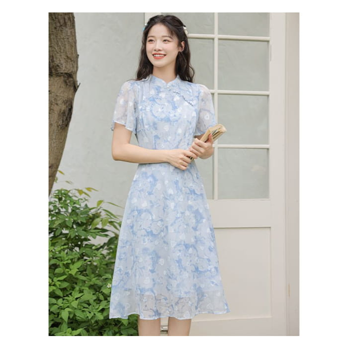Short-Sleeve Band Collar Floral Print Midi A-Line Dress