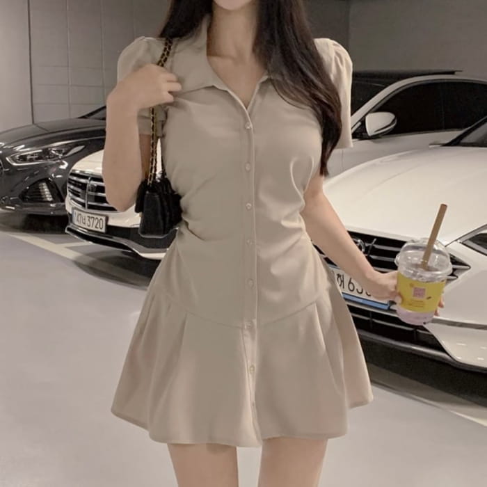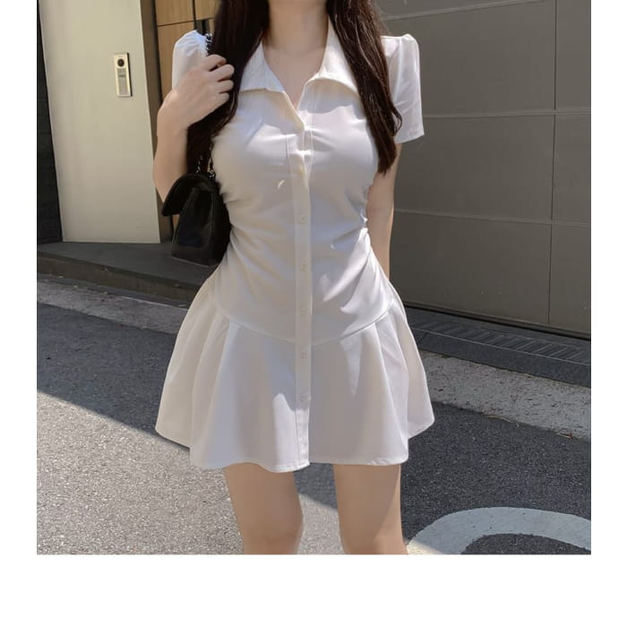 Short-Sleeve Collared Plain Mini Shirt Dress