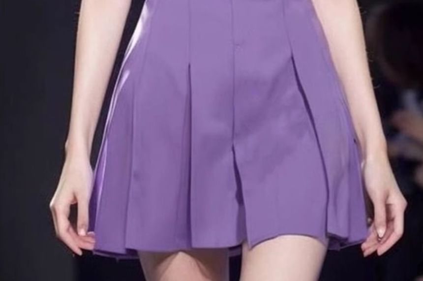 Short Sleeve Collared V-Neck Plain Mini Pleated Dress