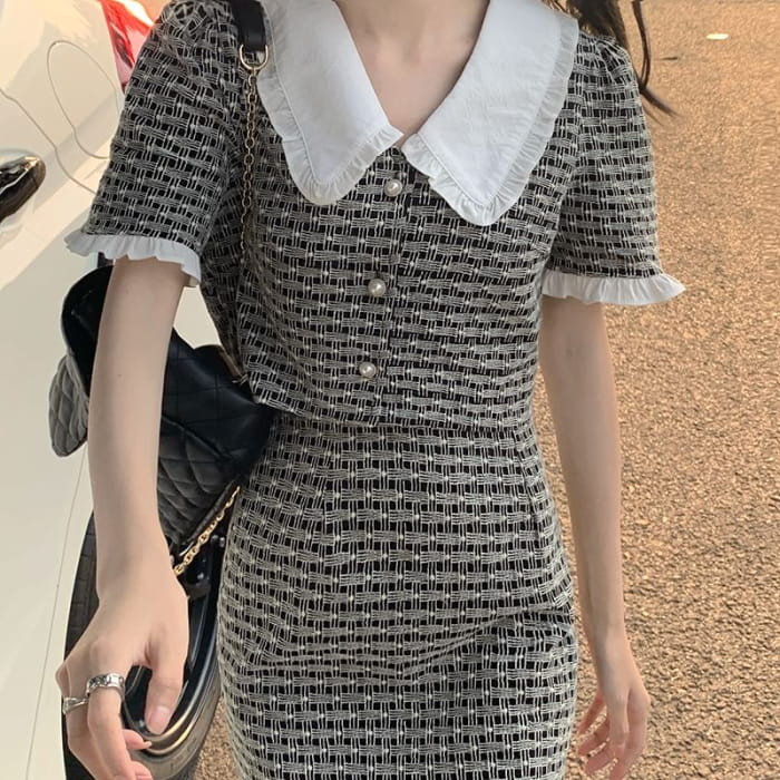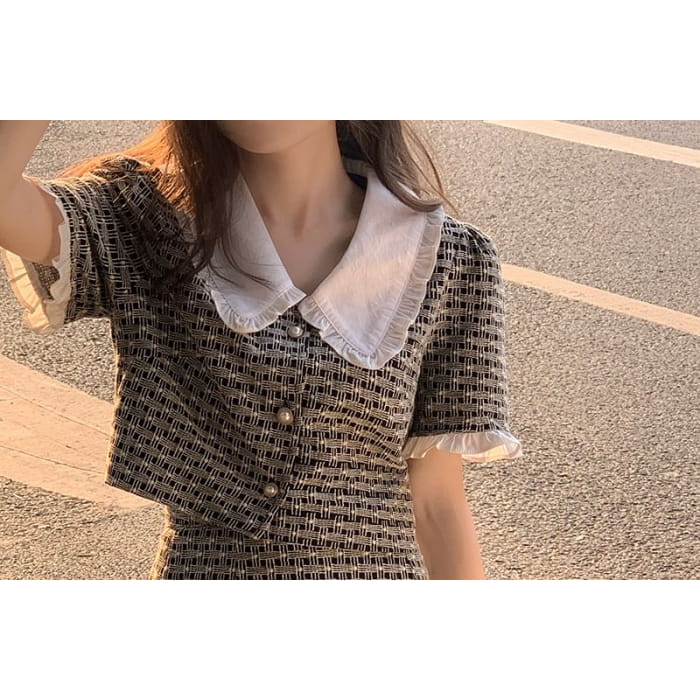 Short-Sleeve Contrast Collar Ruffle Panel Faux Pearl Button Top / High Waist Mini Pencil Skirt