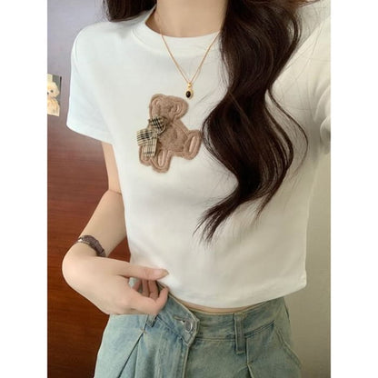 Short-Sleeve Crew Neck Bear Embroidered Cropped T-Shirt