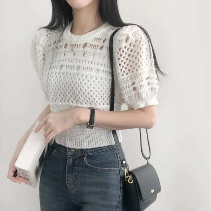 Short-Sleeve Crew Neck Plain Pointelle Knit Top