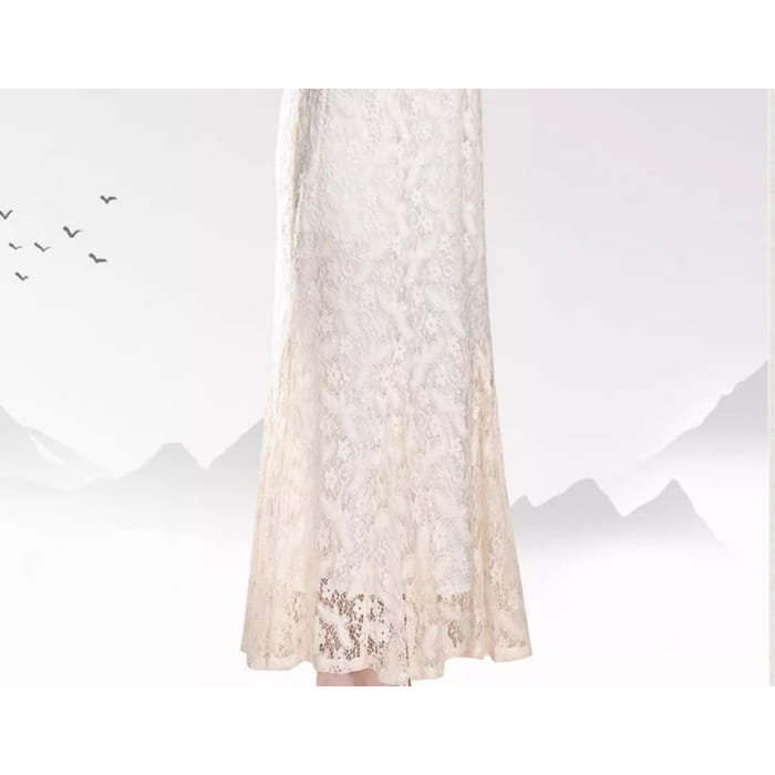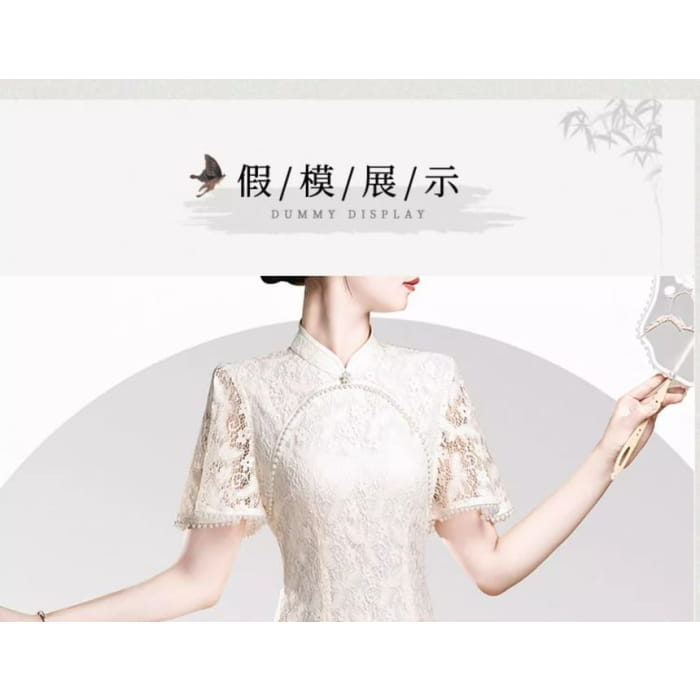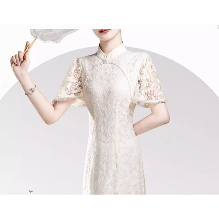 Short Sleeve Mandarin Collar Lace Midi Sheath Dress