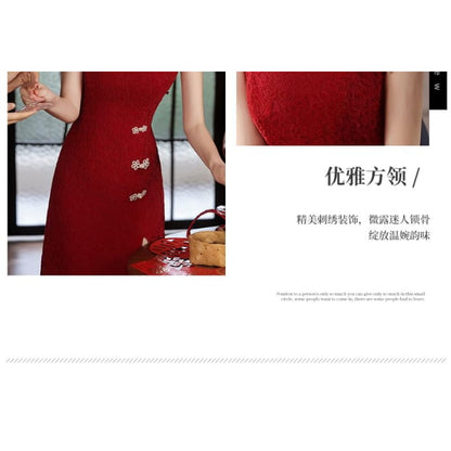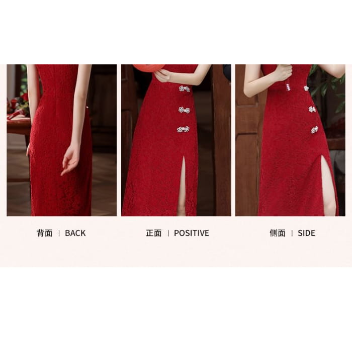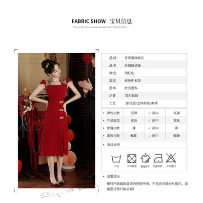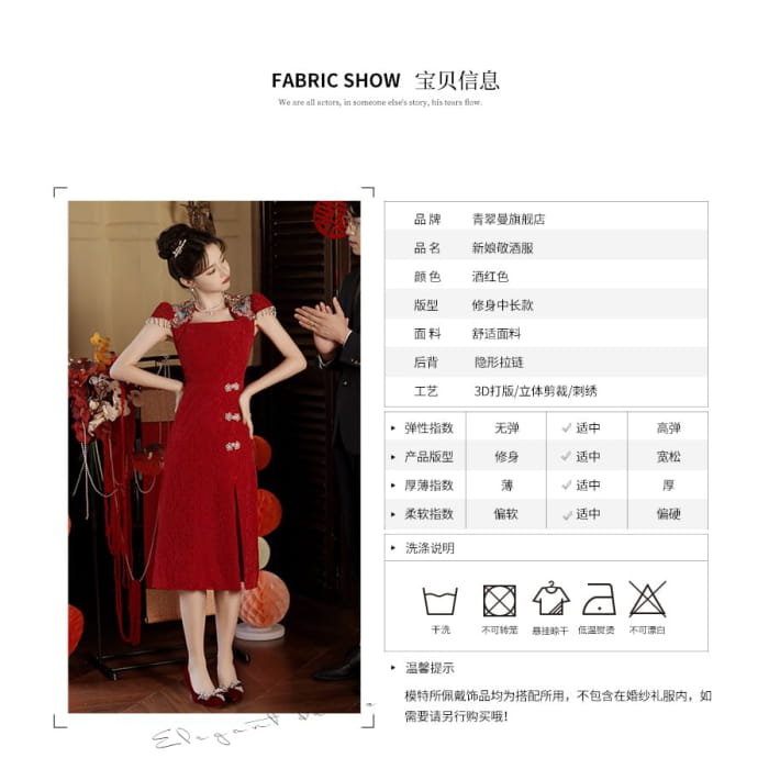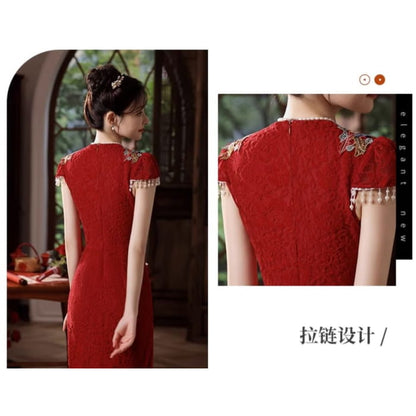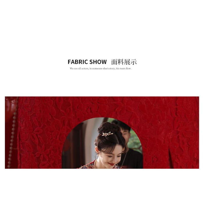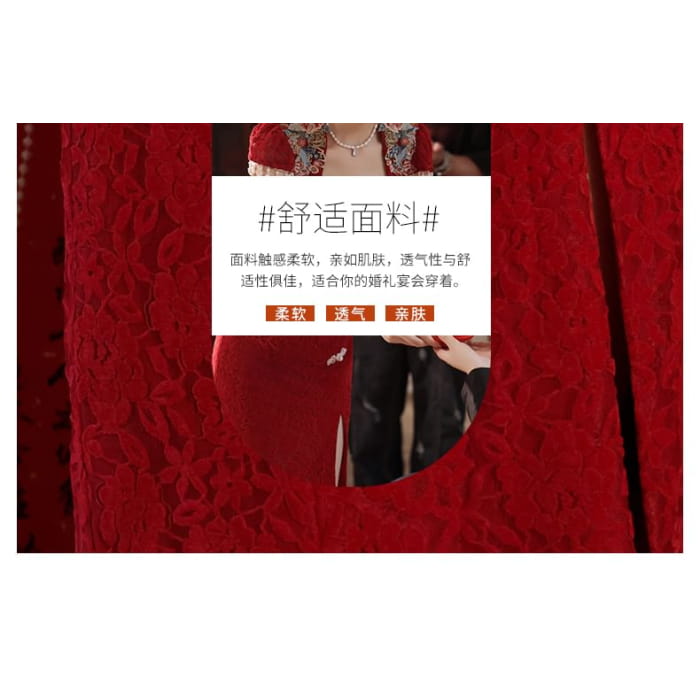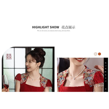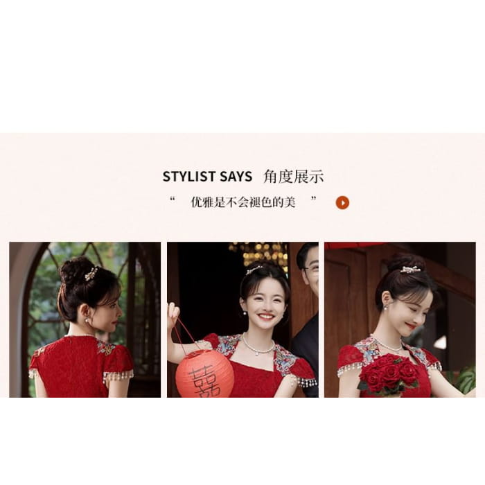 Short-Sleeve Queen Anne-Neckline Embroidered Faux Pearl Trim A-Line Evening Gown