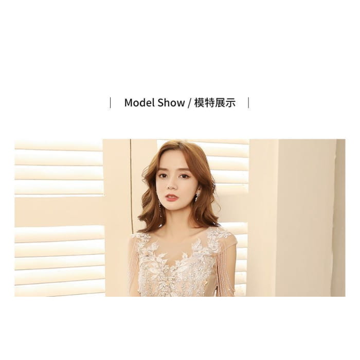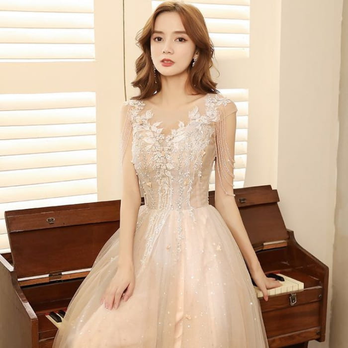 Short-Sleeve V-Neck Lace A-Line Evening Gown
