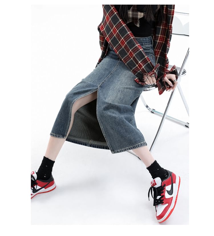 Skirt Pencil Midi Washed Denim High Slit Rise